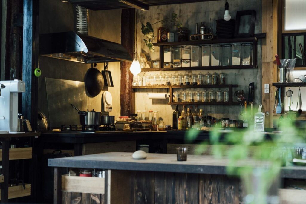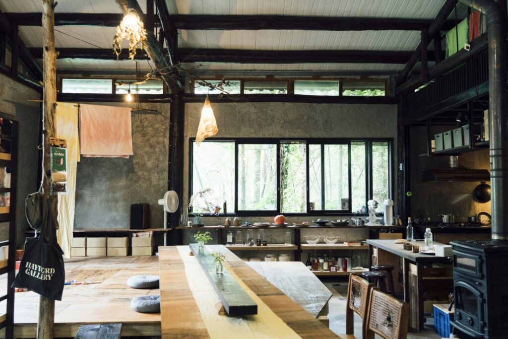 黑色的入字屋頂下,綠色鐵皮就像帳篷的幕垂落在水泥地上,那個山屋的外觀十分樸素,與整座山林毫不違和。跟著思含推開木門踏入其中,麵團、咖啡的香味,與整屋子木質建材的獨特氣味各自在嗅覺裡佔了一席之地。那個山屋擁有樓中樓的結構,裡面每個部分皆由小明和思含一手改造,若試圖從中分類出一般住家的格局,以木頭架高的遊戲區應該算客廳,和門口成對角的廚房有種宮崎駿動畫的奇幻感,上面瓶瓶罐罐的辛香料、咖啡豆,都是屋主變出香氣魔法的原料。